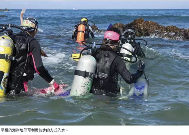 岸潜的入水要注意趁浪较高时顺势入水,但是要回到岸上则应趁浪小时。应视地形的不同采用最合适的方式。