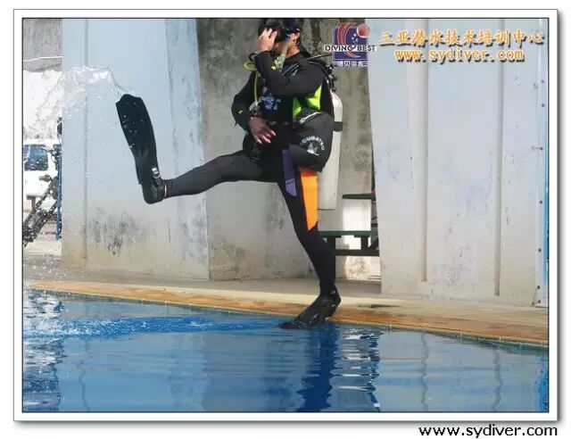 跨步式入水就是装备着装完毕后,直接以大跨步的方式进入水中,适用于潮水落差在一米内的情况,船潜或礁石区的岸潜地形都可採用。入水前先站立于水边,船潜则需注意是否有扶手可辅助站立平衡。入水前一定要确认水面无人、水底无障碍物或深度是否够深,以免撞击受伤。