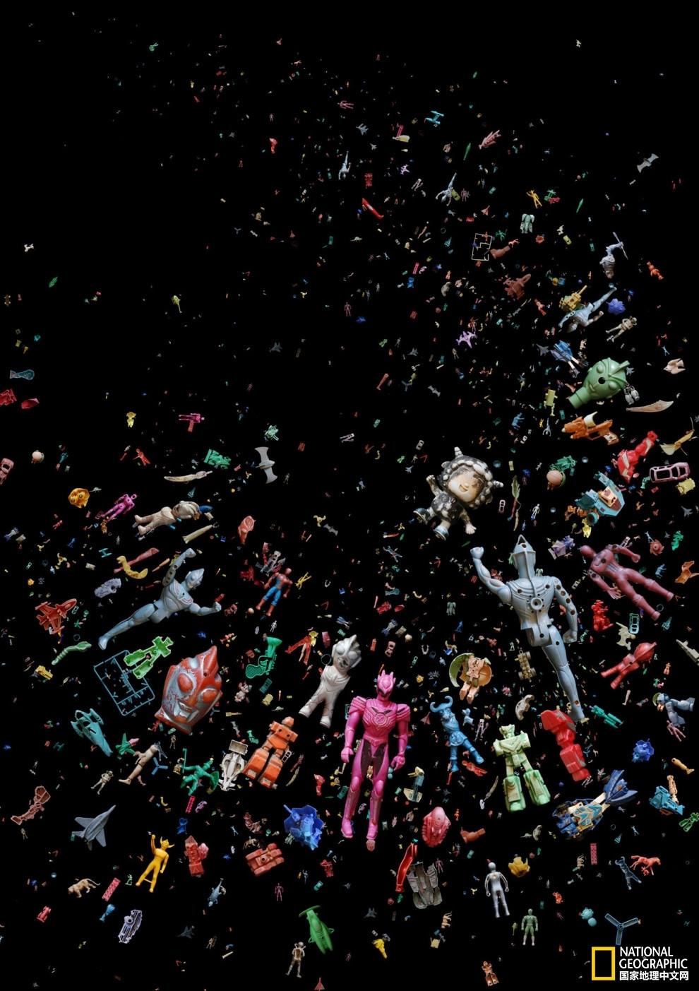 于是她加了点创意,将她找到的垃圾进行分组——将人形公仔、人造花和糯米塑料包装袋聚集起来。每组垃圾都成为了某张照片的焦点,她在工作室内分组和拍摄,将回收的塑料根据大小放置在黑色背景前拍照,这些塑料垃圾从海滩上被捡走后没有清洗和变动过。“先是较小的垃圾,然后是中等大小的垃圾,最后是大型垃圾。”她说道。这些分别拍摄的图层随后会利用Photoshop合成到一张图片中。